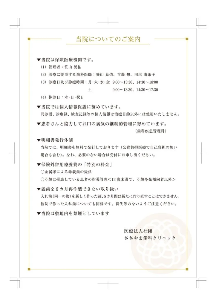 ささやま歯科クリニックでは充分な治療環境を整備し、予防を重視し、生体に優しい治療を行い、口腔から全身への健康に配慮した医療を提供することをお約束します。